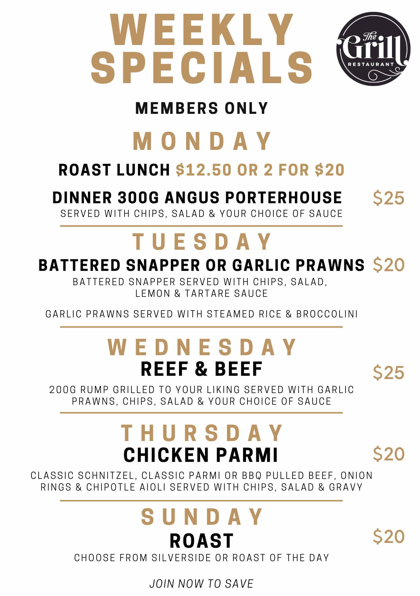 The Grill is a relaxed dining area that caters for a wide variety of tastes and budgets. We provide our patrons with ready to eat roasts and chefs specials which are available for lunch and dinner. Our $16 member’s only lunch specials are available 7 days a week (lunch only) alongside our a-La-Carte menu which is also available 7 days a week.